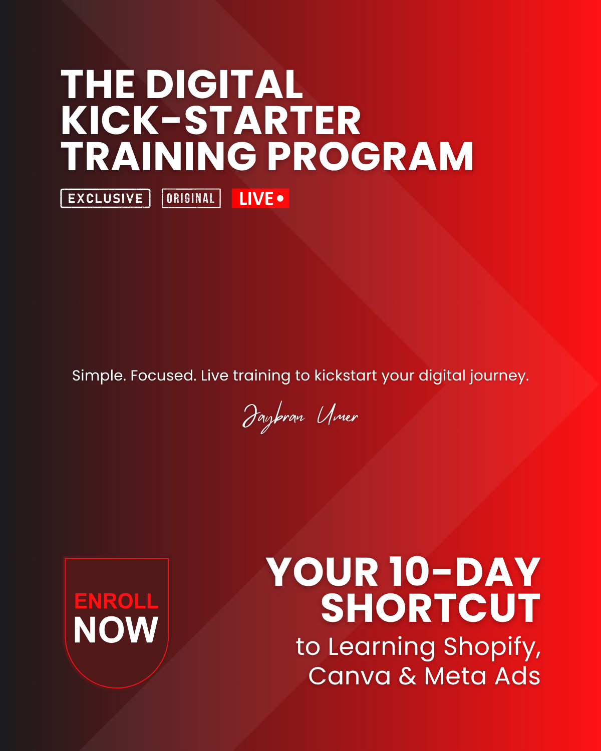 The Digital Kickstarter Program is a live, beginner-focused training experience that gives you a guided roadmap across three powerful tools: Shopify π, Canva π¨, and Meta Ads π’.